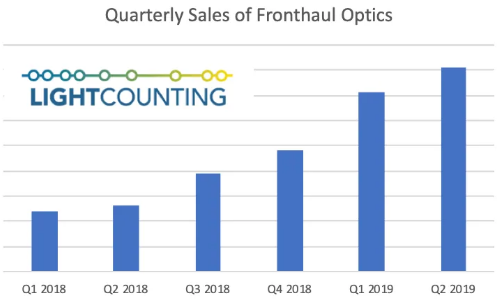 在以太网板块,2019年第二季度100GbE PSM4、LR4和ER4 Lite模块的销售急剧增长。CWDM4收发器的价格似乎趋于稳定,因此其销售在下半年有望增长。200GbE及以上(包括2*200GbE、4*100GbE和400GbE)需求开始攀升,这些产物在2019年的销售收入有望超过2亿美元。