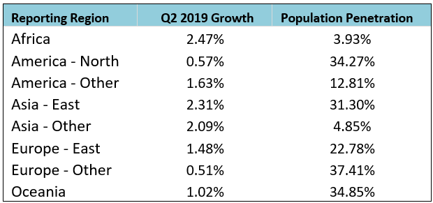 与2019年第一季度相比,世界其他地区的季度增速有所下降,非洲的最大差异为-1.93%。大洋洲紧随其后,为-1.02%。尽管如此,非洲仍然是增长最快的地区(环比增长2.47%)。这是因为其市场饱和率较低导致的,该地区在所有固定宽带用户中的市场占有率第二低,为1.84%,其固定宽带普及率也最低,为3.93%(图6)。