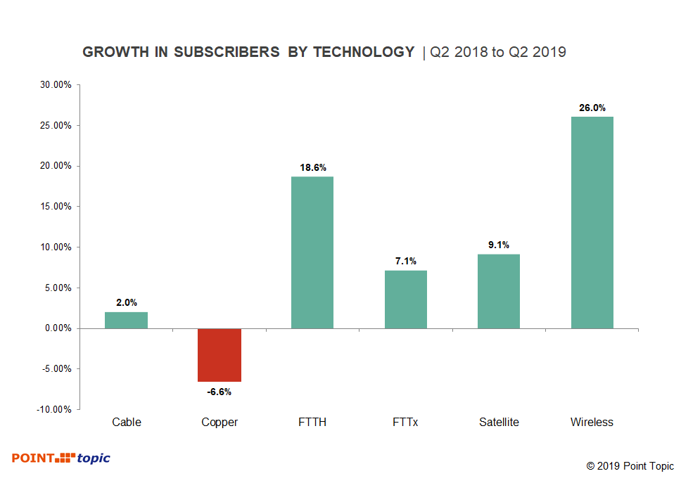 在2018年第二季度至2019年第二季度期间,copper数量下降了6.6%,而FTTH连接数量增长了18.6%,FTTx / VDSL增长了7.1%。