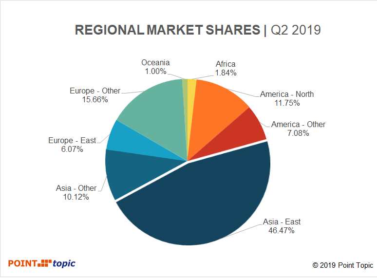 固定宽带用户净增加量中超过63%来自东亚(图3),东亚也保持了所有用户最大的区域市场份额,为47%(图4)。与2019年第一季度相比,所有其他地区的市场份额变化不到一个百分点,亚洲其他地区的市场份额增长了1.4%