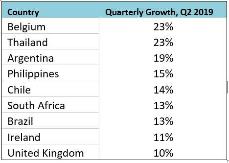 比利时,泰国,阿根廷,菲律宾,智利和南非等国家的贵罢罢贬季度增长率均达到两位数。