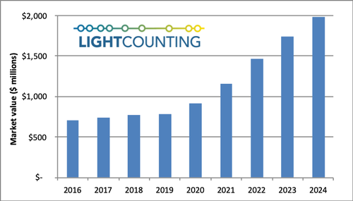 根据LightCounting(LC)对相干和PAM4 DSP芯片组市场的最新预测,光学接口IC芯片组市场现正达到拐点,预计2020-2024年间将以20%的年复合增长率(CAGR)增长(如下图所示)。到2024年,用于以太网收发器和AOC的PAM4 DSP芯片组的销售额将占该市场的一半。应用于DWDM收发器的相干DSP的强劲需求也是该市场增长的驱动力之一。