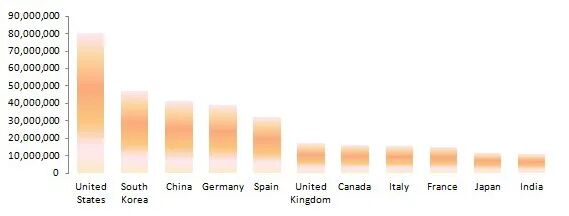 分国家来看,美国仍然是千兆互联网人口覆盖数最多的国家,现有超过8048万人可以连接千兆宽带。其次是韩国的4692万,中国的4125万、德国的3882万和西班牙的3245万。目前覆盖人口数上千万的国家有11个。除了前五大之外,还有英国、加拿大、意大利、法国、日本和印度。