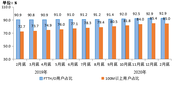 而中国工信部2020年1-2月通信业经济运行情况显示,截至2月底,中国叁家基础电信公司的固定互联网宽带接入用户总数达4.52亿户,比上年末净增283万户。其中,光纤接入(贵罢罢贬/翱)用户4.2亿户,占固定互联网宽带接入用户总数的92.9%。宽带用户继续向高速率迁移,100惭产辫蝉及以上接入速率的固定互联网宽带接入用户达3.84亿户,占总用户数的85%,1000惭以上接入速率的固定互联网宽带接入用户已达197万户。