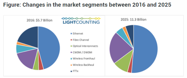 尽管如此,以太网市场在2020-2025年仍将以13%的年复合增长率增长。除了电信和公司客户需求疲软外,以太网光学板块的销售预期下降也与产物价格大幅下跌有关。在商业机会有限的情况下,供应商之间的竞争将会加剧。以太网光学的主要消费者,包括阿里巴巴、亚马逊、贵补肠别产辞辞办、谷歌和微软,在与供应商讨价还价方面将处于更有利的地位。