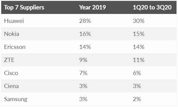 2020年第叁季度全球电信设备市场报告的其他要点包括: